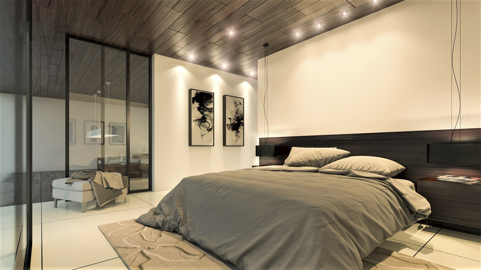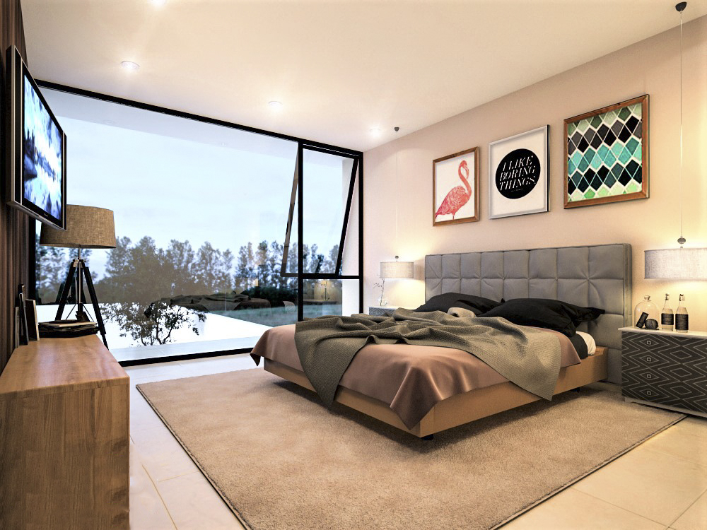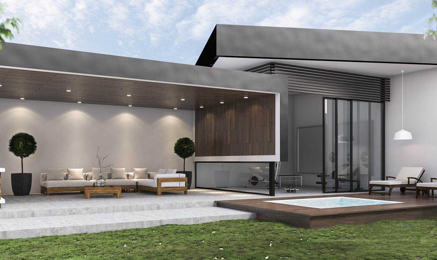 La planta baja cuenta con cochera, un consultorio médico independiente, área de recepción, sala de estar, comedor, cocina, áreas de servicio, recámara principal con baño vestidor, una terraza integrada al primer volumen de la casa y la parte posterior una terraza para eventos con un gimnasio y jaccuzzi. La planta alta se conforma por sala de televisión y área de trabajo o tareas, además de tres recámaras con baño y vestidor.