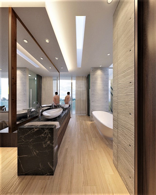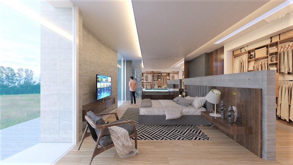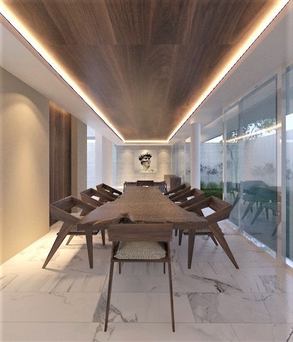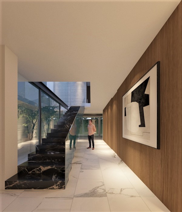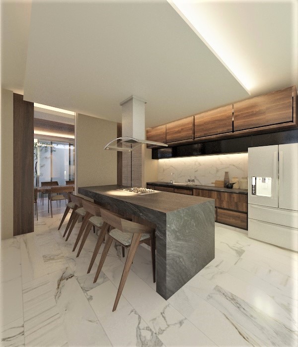 Esta residencia consta de tres niveles. El objetivo era aprovechar al máximo los espacios sin sacrificar la funcionalidad y estética del proyecto. Debido a las restricciones del fraccionamiento y las características del terreno (ubicación, orientación y topografía) se optó por generar una serie de volúmenes intersectados entre sí, que permitieran el paso de la luz del sol y la circulación de los vientos por la casa, ya que la fachada lateral se encuentra hacia el poniente, hacia un área verde de donación del fraccionamiento; cabe señalar que en verano las temperaturas pueden ser muy altas, es por eso, que prácticamente anulamos el uso de ventanales hacia esta fachada. La creación de elementos arquitectónicos que ayudaran a disminuir la sensación térmica de la casa, fue muy importante. Al interior del vestíbulo principal, la casa cuenta con un jardín interior que llena de luz y frescura el espacio en los tres niveles, aprovechando la luz cenital, pero evadiendo el acceso de los rayos solares directos.